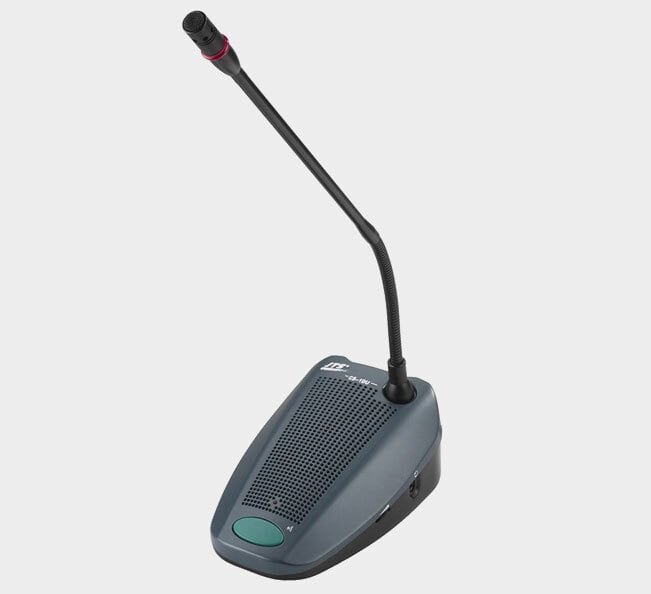 The delegate unit enables the attendants to participate in a discussion by speaking through a microphone, controlled by a microphone ON/OFF push-button, and listening to discussion by the internal loudspeaker and external headphone.
